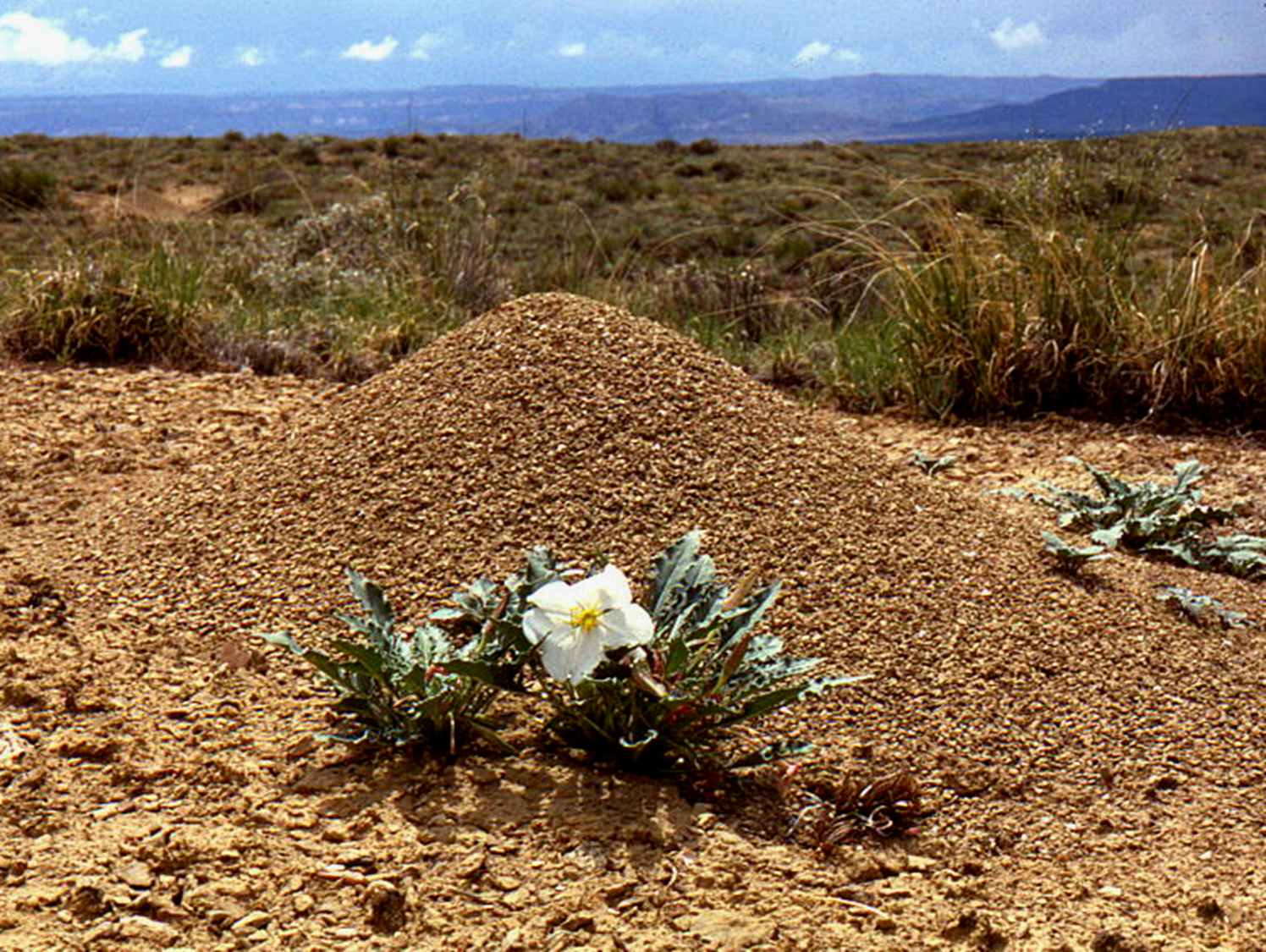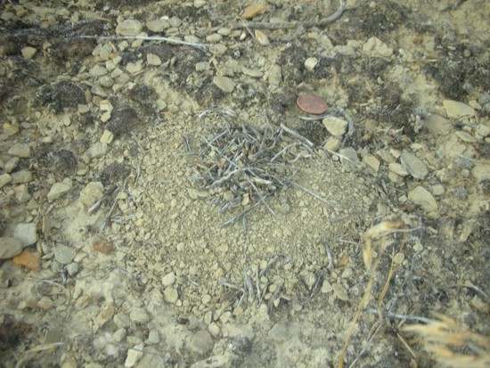 A mature harvester ant colony. The mounds are approximately elliptical in area with a cone that is often offset to the north and west. This makes the south-eastern slope the longest of the nest, and this is often where the nest entrance is.