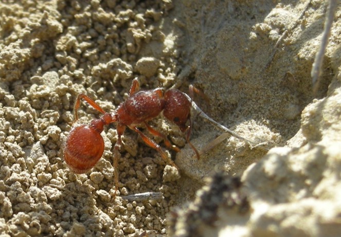 When the queen reaches a chosen nest site, she digs into the soil. It is critical for her to get below the surface before the summer sun kills her. She digs more than a meter within the first few days. She will leave the nest to forage during this time of colony founding. She may travel tens of meters on the surface looking for seeds or insects to bring back underground. For two weeks after the mating flight, it is common to see queens foraging. The first workers are produced in about one month and then the nanitics (the very small first workers) are often seen.